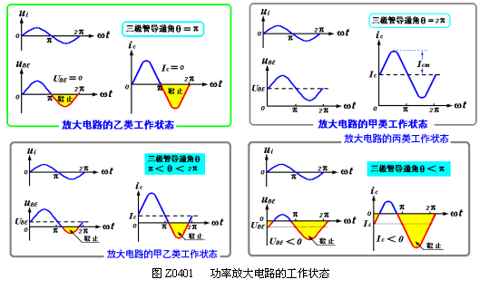 功放电路的工作状态有、、及丙类。它们的定义如下图Z0401所示。