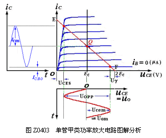 当集电极电流iC减小时,根据电磁感应定律,变压器初级线圈中的感应电压与直流电源电压EC串联相加,使管压降Ucem ≈2EC,因此,甲类功放管的最大允许集电极电压BVCER必须大于2EC。