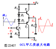 图Z0407为OCL甲乙类放大电路。T1为前置级,D接在输出级的基极回路内,静态时的D两端有一定的正向压降,给T2、T3提供一个适当的正向偏压,产生相应的偏流,从而避免了交越失真。OCL电路的缺点是必须采用双电源供电。