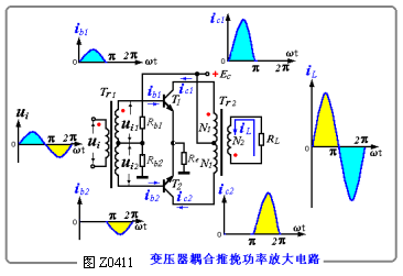 一、特点耦合推挽功率放大电路如图Z0411所示。其特点是: (1)T1和T2,由两个NPN同型号并且特性完全相同的管子组成; (2)利用变压器原、副边匝数比的不同实现变换,将实际的RL通过原、副边的匝数比(n = N1 / N2),变换成所需要的等效 (3)为了减小交越,静态时利用基极偏置电路,使T1和T2 具有较小集电极IC1=IC2。由于输出变压器原绕组两部分(N1 和N2 )的绕向一致,而IC1和IC2的流向相反,故绕组的直流磁势IC1 N1 - IC2 N2=0,即铁芯中无,工作时不致产生磁饱和现象。这是它的主要优点之一。 二、工作原理 静态时,iL = 0,无功率输出。因为无输入信号(ui = 0)时,IC1和IC2很小,供给的直流功率也很小。 当输入正弦信号ui时,则通过输入变压器Tr1将使T1和T2基极得到一个大小相等而极性相反的信号电压ui1和 ui2。当ui为正半周时,由变压器的同名端可知ube1为正,ube2为负。于是T1导通,T2截止。此时,输出变压器Tr2的原边上半边绕组有集电极电流iC1流过,而下半边绕组无电流,iC2 =0。同理,在ui 的负半周时,情况正好相反,T1 截止,T2导通。Tr2原边上半边绕组无电流通过,而下半边绕组有电流。于是在一个的两个半周内。iC1、iC2轮流通过Tr2的原边上下两半绕组,而且大小相等,相反。因此,Tr2 的副边将有一个较完整的正弦波iL通过通过负载RL 。 变压器耦合推挽功率放大电路与互补对称电路比较,前者虽然解决了负载与放大电路输出级的问题,但其体积大、笨重、频带窄、不便于集成等缺点限制了它的使用范围。 |