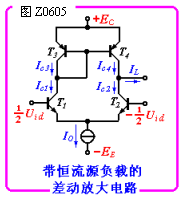 图Z0605是带恒流源负载的差动放大电路。图中,T1 、T2组成带恒流源的差动放大电路,T3、T4 组成镜像恒流源电路,作为差动放大电路的有源负载。这种差动放大电路不仅电压放大倍数大,而且共模输入电压范围也大。当uid输入时,T1 管集电极为IC1,T2 管集电极电流为 - IC2,且- IC2 = IC1 ;当T1管集电极电流增加的同时,T3 管电流必然也增加,且IC1 = IC3;由于IC3与IC4 为镜像关系,即IC3= IC4,这样流过负载的电流