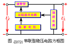 由上述分析可以看出,典型的串联型稳压电路是由调整电路、取样电路、基准和比较放大电路四个基本部分组成。其框图如图Z0721所示。
