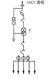 对于10Kv供电的用户的变、配电所的主接线多采用线路变压器组或单母线接线方式。10kV容量为160-600kVA的工企用电单位的变、配电所多采用高供低量的供电方式,既高压供电、在低压则计量但应加计变压器损失。对于这种供电方式的用户常采用线路、变压器组方式的主接线系统(如图1-2-2)。