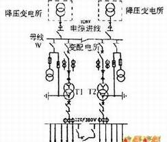 来自两个不同供电局变电站的两路高压经户外隔离开关、器、高压断路器接到高压母线,然后经隔离开关、计量柜、测量及避雷器柜、出线柜接到降压变压器。