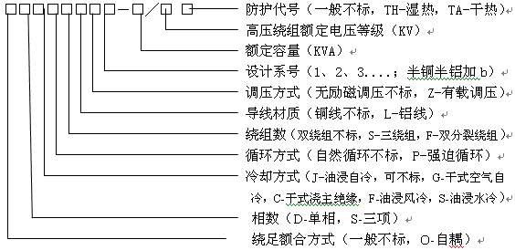 电力变压器可以按相数/绕组数目/铁心形式/冷却方式等特征分类。 按相数分:单相/三相/多相等; 按绕组数:双绕组/自耦/三绕组/多绕组 ;铁心形式:心式/壳式 ;冷却方式:干式/油浸式等 。如表2-2所示,但是,这样的分类包含不了变压器的全部特征,所以在变压器型号中往往要把所有特征均表达出来,并标记以额定容量和高压绕组额定电压等级。图1-2-4时电力变压器产品型号的表示方法。