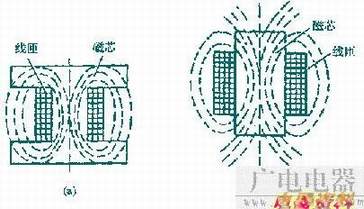 立式电感器无此缺点,其线圈都绕在“工”形或“王”形磁芯上,甚至绕在很薄的“工”形的磁芯上,工作时磁力线很少散发.有效导磁系数较高,磁场辐射小,对邻近部件影响小。同时占空系数小,分布电容也小。如图(b)