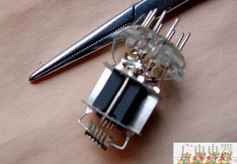 这是颗用于高频放大的通用双三极管6N1。1是吸气剂;2是灯丝阴极和栅极的组合体;3就是阳极。
