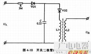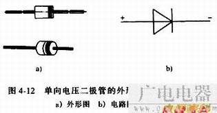 单向电压开关二极管也称转折二极管,邮N四层结构的硅半导体材料组成,其正向为负阻开关特性(指当外加电压升高到正向转折电压值时,开关二极管由截止状态变为导通状态,即由高阻转为低阻),反向为稳定特性。图4-12是单向电压开关二极管的外形图和电路图形符号。