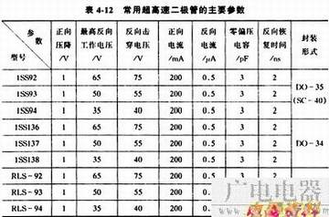 常用的高反压开关二极管有RLS系列(表面封装)和1SS系列(有引线塑封),其主要参数见表4-14。
