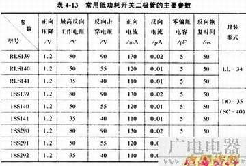 常用的低功耗开关二极管有RLS系列(表面封装)和1SS系列(有引线塑封),表4-13为其主要参数。