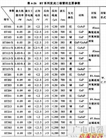常用的国产普通单色发光二极管有BT(厂标型号)系列、FG(部标型号)系列和2EF系列,见表4-26、表4-27和表4-28。