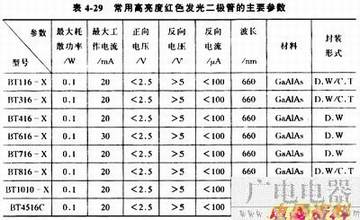 常用的高亮度红色发光二极管的主要参数见表4-29,常用的超高亮度单色发光二极管的主要参数见表4-30。
