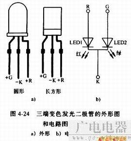图4-24是三端变色发光二极管的外形和电路图形符号