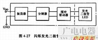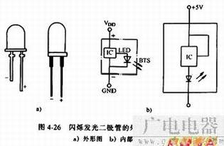4.闪烁发光二极管 闪烁发光二极管(BTS)是一种由和发光二极管组成的特殊发光器件,可用于报警指示及欠压、超压指示。其外形、内部结构图及内电路框图见图4-26和图4-27。
