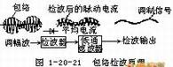 狭义的检波是指从调幅波的包络提取调制信号的过程。因此,有时把这种检波称为包络检波幅度检波。图1-20-21表示出了这种检波的原理:先让调幅波经过检波器(通常是晶体),从而得到依调幅波包络变化的,再经过一个低通滤去高频成分,就得到反映调幅波包络的调制信号。