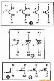 由于型和NPN型三极管在使用时对的极性要求是不同的,所以在三极管的图形符号中应该能够区别和表示出来。图形符号的标准规定:只要是PNP型三极管,不管它是用锗材料的还是用硅材料的,都用图13(a)来表示。同样,只要是NPN型三极管,不管它是用锗材料还是硅材料的,都用图13(b)来表示。图13(c)是的符号。图12(d)表示一个硅NPN型磁敏三极管。