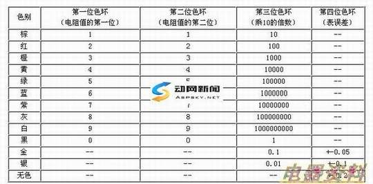 带有四个色环的其中第一、二环分别代表阻值的前两位数;第三环代表倍率;第四环代表误差。快速识别的关键在于根据第三环的颜色把阻值确定在某一数量级范围内,例如是几点几 K、还是几十几K的,再将前两环读出的数"代"进去,这样就可很快读出数来。