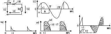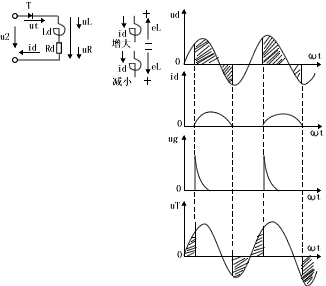 | 1、单相半波可控整流 (1)性负载(见图1) 1)电阻性负载,id波形与ud波形相似,因为可控硅T与负载电阻Rd串联,所以id=id。 2)可控硅T承受的正向电压随控制角α而变化,但它承受的反向电压总是负半波电压,负半波电压的最大值为 3)线路简单,多用在要求不高的电阻负载的场合。 (2)感性负载(不带续流,见图5): 1)电机电器的电磁线圈、带的电阻负载等均属于性负载。 2)电感具有障碍电流变化的作用可控硅T导通时,其压降uT=0,但电流id只能从零开始上升。id增加和减少时线圈Ld两端的感应eL的极性变化如图示。 |