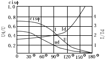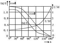 | 比值Ud/U,I/Id和cosψ随α的变化数值见表二,相应关系曲线见图4 表二、 Ud/U、I/Id、cosψ与α的关系表 |