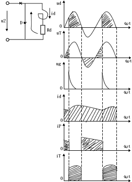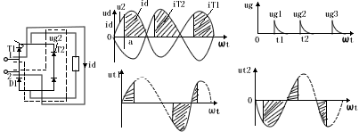 t1时刻加入ug1,T1导通,电流通路如图实线所示。uT1=0,ud=u2,uT2=-u2。u2过零时,T1自行关断。 |