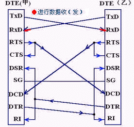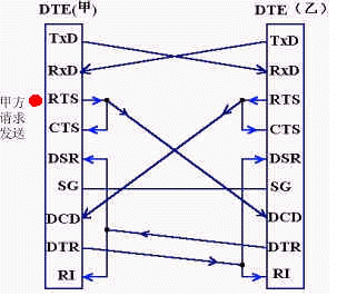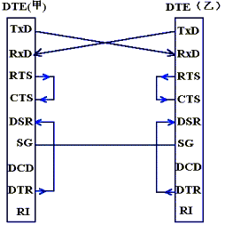 (2)甲方的RTS和CTS相连,并与乙方的DCD互连。即:一旦甲方请求发送(RTS),便立即得到允许(CTS),同时,使乙方的DCD有效,即检测到载波信号。