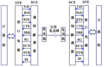 1、采用Modem(DCE)和电话网通信时的信号连接: