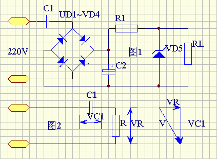 最简单的电容降压直流供电电路及其等效电路如图1,C1为降压电容,一般为0.33~3.3uF。假设C1=2uF,其XCL=1/(2PI*fC1)=1592。由于整流管的导通只有几欧姆,VS的动态为10欧姆左右,限流R1及电阻RL一般为100~200,而电容一般为100uF~1000uF,其容抗非常小,可以忽略。若用R代表除C1以外所有元器件的等效电阻,可以画出图2的交流等效电路。同时满足了XC1>R的条件,所以可以画出向量图。