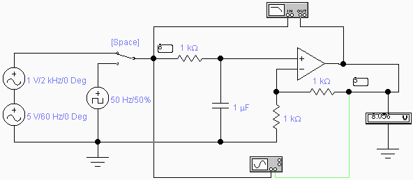 在电路工作区输入如下图电路。其中包含两个正弦交流源,一个为1V 2k, 一个为5v 60Hz,另有一个脉冲电压源(时钟源),幅度5V, 50Hz, 占空比50%,两组用开关来切换。电路的输入为节点8,输出为节点3。如图连接波特图仪、示波器和电压表。