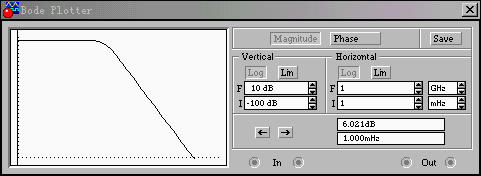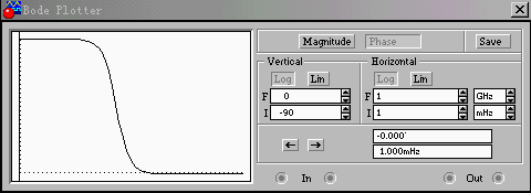 ④从波特图仪的面板上观测电路的幅频特性和相频特性。如果对波特图仪面板参数进行修改,修改后建议重新启动电路,以保证曲线的精确显示。