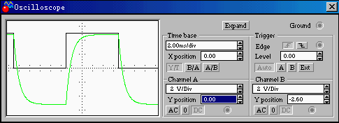 按空格键将开关连接到周期脉冲信号源上。启动电路仿真开关,这时在示波器上可以看到两个波形(下图)。输入波形为周期方波,输出波形为按指数规律上升、下降的脉冲序列。改变输入脉冲波的频率,可以看到输出波形的形状发生变化。