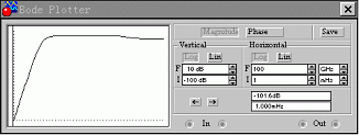 双击波特图仪图标打开其面板,然后单击仿真启动开关,在波特图仪的显示屏幕上可以观看电路的幅度频率特性和频率特性曲线。曲线如下两图所示。