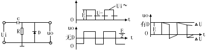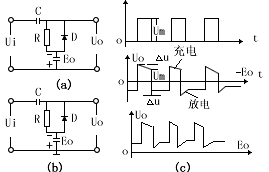 箝位电路可以把信号箝位于某一固定电平上,如图三(a)电路,当输入Ui=0期间,D截止,Uo=-Eo;而当输入Ui突变到Um瞬间,C相当短路,输出Uo由-Eo突变至Um,这时D截止,C经R及Eo充电,但充电速度很慢,使Uo随C充电稍有下降;当Ui从Um下降为零瞬间,Uo也负跳幅值Um,此时D导通,C放电很快,因此输出信号起始电平箝位于-Eoo同理,电路(b)的输出信号箝位于Eoo值得注意的是,箝位电路不仅使输出信号的起始电平箝位于某一电平,而且能使输出信号的顶部电平箝位于某一数值,电路元件估算公式如下: |