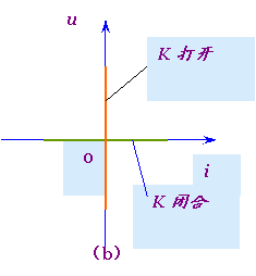 当K闭合时,其伏安关系为电压u恒为0,i=不定值(其值由开关以外的电路工作状态决定),其伏安关系曲线为u-i平面上的i轴,如图1-3-4(b)所示,相应于电阻值R=0。