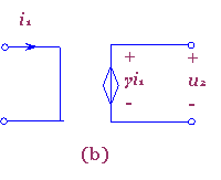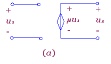 受控源有两对端钮:一对为输入端钮,另一对为输出端钮。输入端钮施加控制的电压或电流,输出端钮则输出被控制的电压或电流。因此,理想的受控源电路有四种,如图1-6-1所示。其中图(a)为电压控制电压源(VCVS),控制量为电压u1;图(b)为电流控制电压源(VS),控制量为电流i1;图(c)为电压控制电流源(VCCS),控制量为电压u1;图(d)为电流控制电流源(CCCS),控制量为电流i1。图中的菱形符号即表示受控源,以与独立源的符号相区别;μ,γ,g和α为有关的控制系数;μ和α为纯树,γ具有量纲,g具有量纲。当这些控制系数为常数时,则为先行受控源。我们以后提到的受控源都是指线性受控源。表征理想线性受控源输出特征的数学方程分别为: