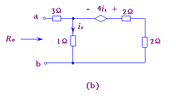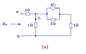 解:首先将受控电流源2i1与2Ω电阻的并联组合,等效变换为受控电压源4i1与电阻2Ω的串联组合,其变换原则与独立电压源和独立电流源的相互等效变换原则全同,如图2-4-3(b)所示.然后再将受控电压源4i1 与电阻(2Ω+2Ω)的串联组合,等效变换为受控电流源i1与电阻4Ω的并联组合,如图2-4-3(c)所示.可见简化后的电路图(c),保留了控制变量i1支路不动.于是根据图(c)电路,从端口ab处外施以电压u以求得电流i即: