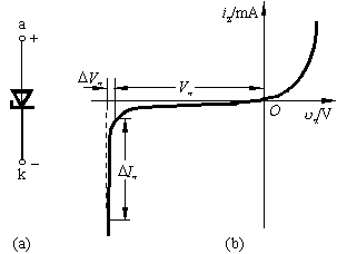又称,它是一种用特殊工艺制造的面结型硅半导体,其代表符号如图(a)所示。前已提及,这种管子的杂质浓度比较大,空间电荷区内的电荷密度也大,因而该区域很窄,容易形成强电场。当反向加到某一定值时,急增,产生反向,其特性如图(b)的所示。图中的VZ表示反向,即的稳定电压。稳压管的稳压作用原理在于,有很大增量时,只引起很小的电压变化。反向击穿曲线愈陡,动态愈小,稳压管的稳压性能愈好。