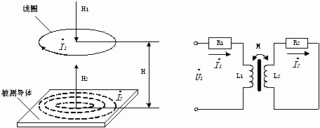 如图4.3.1所示,一个扁平线圈置于金属导体附近,当线圈中通有交变电流I1时,线圈周围就产生一个交变磁场H1。置于这一磁场中的金属导体就产生电涡流I2,电涡流也将产生一个新磁场H2,H2与H1方向相反,因而抵消部分原磁场,使通电线圈的有效阻抗发生变化。