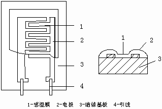 图2.5.3是氯化锂湿敏电阻的结构图。它是在聚碳酸酯基片上制成一对梳状金电极,然后浸涂溶于聚乙烯醇的氯化锂胶状溶液,其表面再涂上一层多孔性保护膜而成。氯化锂是潮解性盐,这种电解质溶液形成的薄膜能随着空气中水蒸汽的变化而吸湿或脱湿。感湿膜的电阻随空气相对湿度变化而变化,当空气中湿度增加时,感湿膜中盐的浓度降低。