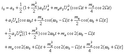 上式表明,检波电流i0中包含有直流分量、低频分量(Ω和2Ω)及高频分量(ω0、ω0±Ω、2ω0和2ω0±2Ω)。当通过滤波电容和隔直电容去掉高频和直流分量后,检出低频分量为: