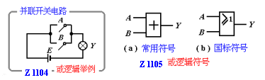 二、或逻辑及或门 或逻辑指的是:在决定某事件的诸条件中, 只要有一个或一个以上的条件具备,该事件就会发生;当所有条件都不具备时,该事件才不发生的一种因果关系。如图Z1104所示电路,只要开关A或B其中任一个闭合,灯泡Y就亮;A、B都不闭合,灯泡Y才不亮。这种因果关系就是或逻辑关系。可表示为:Y=A+B,读作"A或B"。在逻辑运算中或逻辑称为逻辑加。 或门是指能够实现或逻辑关系的门电路。或门具有两个或多个输入端,一个输出端。其逻辑符号如图Z1105所示。 或门的输出与输入之间的逻辑关系用逻辑表达式表示为: Y=A+B GS1104 两输入端或门电路的真值表和波形图分别如表Z1105和图Z1106所示。 表 Z1105