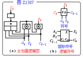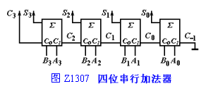 如把多个全加器组合起来,即可完成多位二进制加法。图Z1307表示两个4位二进制数相加的逻辑图。