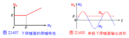图Z1606所示的限幅电路中,因二极管是串在输入、输出之间,故称它为串联限幅电路。图中,若二极管具有理想的开关特性,那么,当ui低于E时,D不导通,uO=E;当ui高于E以后,D导通,uO=ui。该限幅器的限幅特性如图Z1607所示,当输入大于E的正弦波时,输出电压波形见图Z1608。可见,该电路将输出信号的下限电平限定在某一固定值E上,所以称这种限幅器为下限幅器。如将图中二极管极性对调,则得到将输出信号上限电平限定在某一数值上的上限幅器。