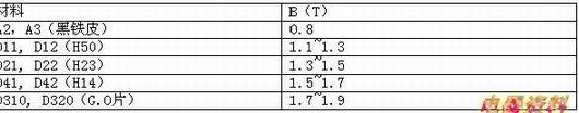 B值视铁芯材料不同取值亦会不同,通用矽钢片材料及其取值勤见下表: