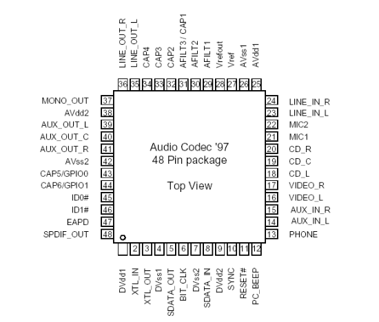 在集成AC'97声卡的主板上,你也可以看到一块或者几块这样封装的芯片。AC'97 Codec的引脚定义是相同的,声卡设计商可以通过配置不同的CODEC来改变声卡的档次,例如著名的Live!系列,最大的区别其实就是CODEC的不同。引脚定义的相同可以大幅降低设计成本。另外,AC'97 Codec还可以带一些音效处理功能。