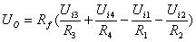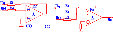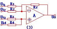 | 它的电路图如图(3)所示: 此电路的功能是对Ui1、Ui2进行反相求和,对Ui3、Ui4进行同相求和,然后进行的叠加即得和差结果。 | |