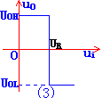 | 下面我们对它们进行分析一下(只对图(1)所示的电路进行分析) 它的传输特性如图(3)所示: 它表明:输入电压从低逐渐升高经过UR时,uo将从高电平变为低电平。相反,当输入电压从高逐渐到低时,uo将从低电平变为高电平。 |