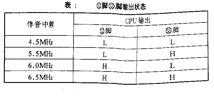 1.手动式制式切换:当电视机要接收多制式信号时,图象中频电路的选频特性需要改变,根据所接收的不同制式的要求改变图象中频带宽.另外,鉴频器要能对上述四种不同频率的伴音信号进行鉴频还要求用不同的带通把所需的伴音中频信号选出来,为了能用同一FM检波器解调不同频率的第二伴音中频信号,其鉴频回路参数也必须要作相应的改变.所有这些需要用开关信号对相应电路进行切换.这里我们以日本松下M16机芯彩电为例说明:是此机芯伴音制式控制电路,伴音中频电路的控制信号来源于1213(CPU)的52和53脚,它们的输出状态由键盘控制.它对应的52.53脚输出状态如表1,由表1可看出,CPU52脚53脚输出分别经Q107,Q109缓冲后分为三路:一路经D103,D104进行运算去控制开关管Q108,Q116的状态,从而改变图象中频电路的带宽.第二路由10脚和9脚送入IC201内经逻辑电路译码分别控制两个四通道模拟开关的工作状态,以实现伴音中频陷波和选通.第三路分别通过R252.R243.R244去控制FM检波器中的二极管开关改变鉴频回路的参数,实现正确解调.