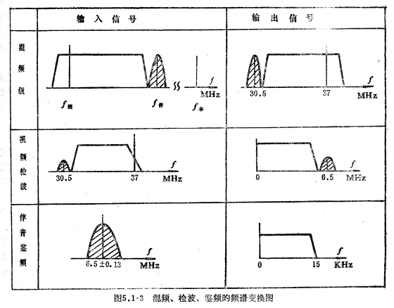 电视天线周围存在着各种各样的电磁波,由天线和输入电路选出欲接收频道的电视信号,再经过高频放大器有选择性的放大,与本振输出的频率较高的正弦波得到中频信号。图5.1-3示出混频级输入和输出信号频谱变换图。在变频前,图象载频低于本频道的伴音载频;变频后,图象中频高于伴音中频。这是由于本振频率高于图象载频和伴音载频的缘故。但是,图象中频和伴音中频之差不变,例如,保持6.5MHz。