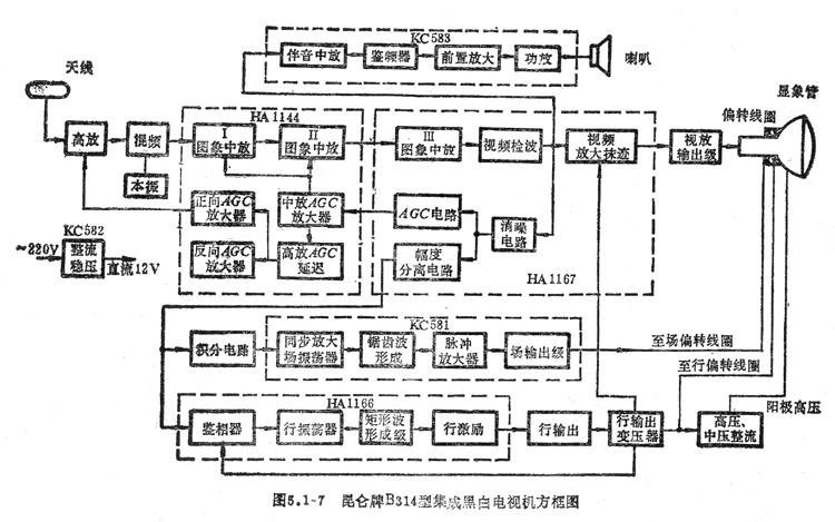 图5.1-7是昆仑牌B341型集成黑白电视机,它由六块集成电路组装而成。除了高频谐调器、行输出、视放输出管和电源调整管外,其余有源器件,都由集成电路组成。它们的机芯可以通用于14时、16时黑白显象管,电、光、声性能均能满足一般使用要求,国内还有许多电视机与它相似。