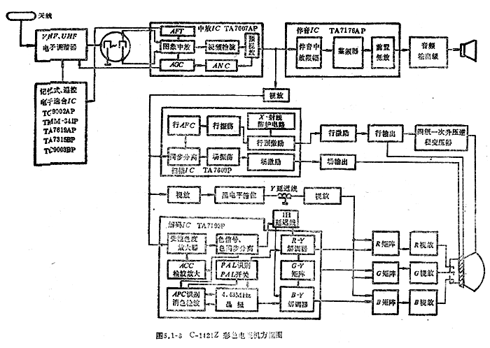 图5.1-8为日本东芝公司生产的C-1421Z彩色电视机的方框图。图象中频系统由F1026Y和单块图象中频集成电路TA7607AP组成。它能完成图象中频放大、视频同步检波、AGC检波、中放AGC和延迟高放AGC电路AFT电路、预视放及自动抑制(ANC)等功能,是一块完整的图象中频系统集成电路。它的延迟AGC电压是负控的,以配合双栅MOS管高频调谐器的AGC电路工作。若要配合NPN高频调谐器的AGC电路,可选用TA7611P,它的延迟AGC电压是正控的,其他功能与TA7607AP相同。